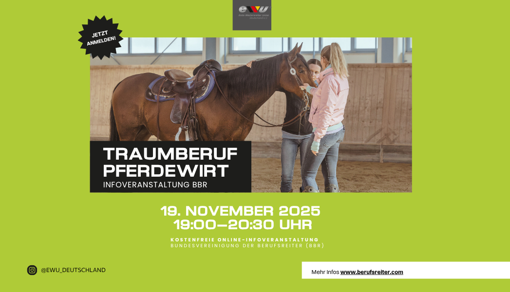 Am 19. November 2025 lädt die Bundesvereinigung der Berufsreiter (BBR) von 19:00 bis 20:30 Uhr zu einer kostenlosen Online-Informationsveranstaltung via Zoom ein.